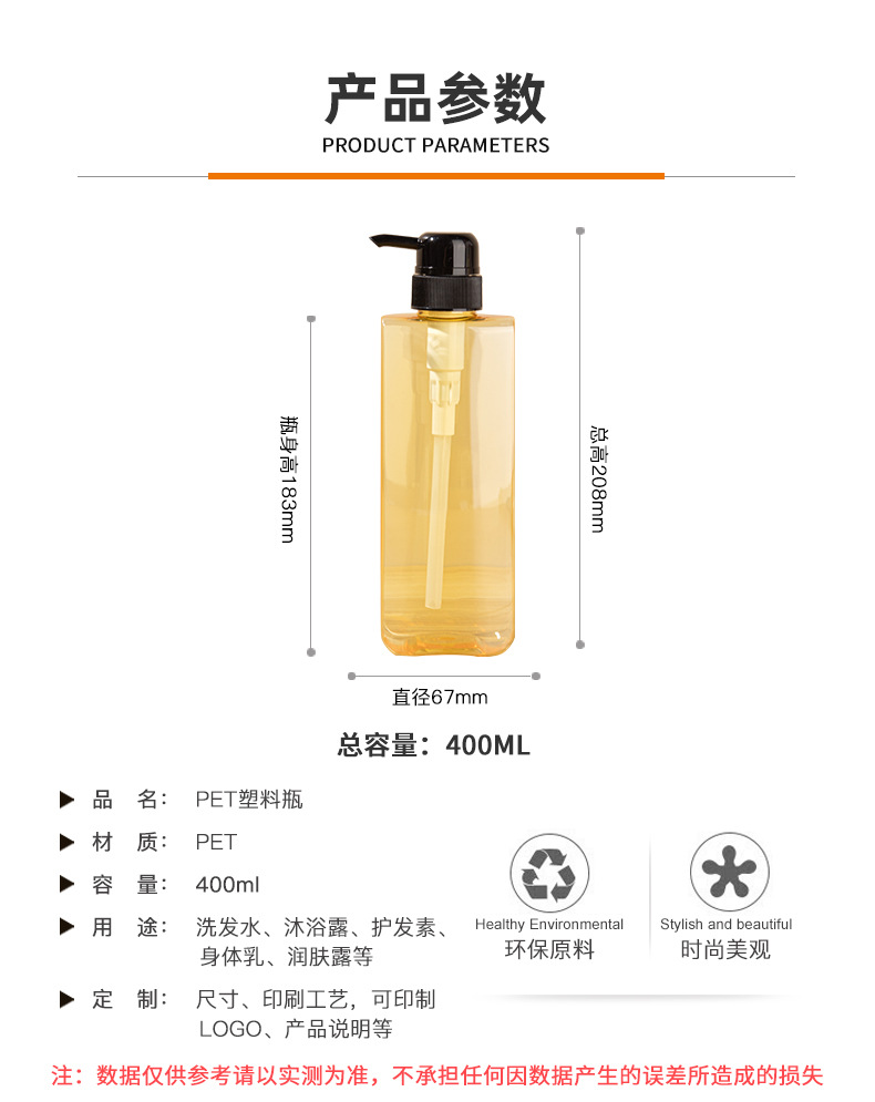 • PET扁方瓶塑料瓶包材400ml化妝品洗護(hù)瓶洗發(fā)水瓶沐浴露乳液瓶,適用洗發(fā)水、沐浴露、護(hù)發(fā)素、身體乳、潤膚露等。